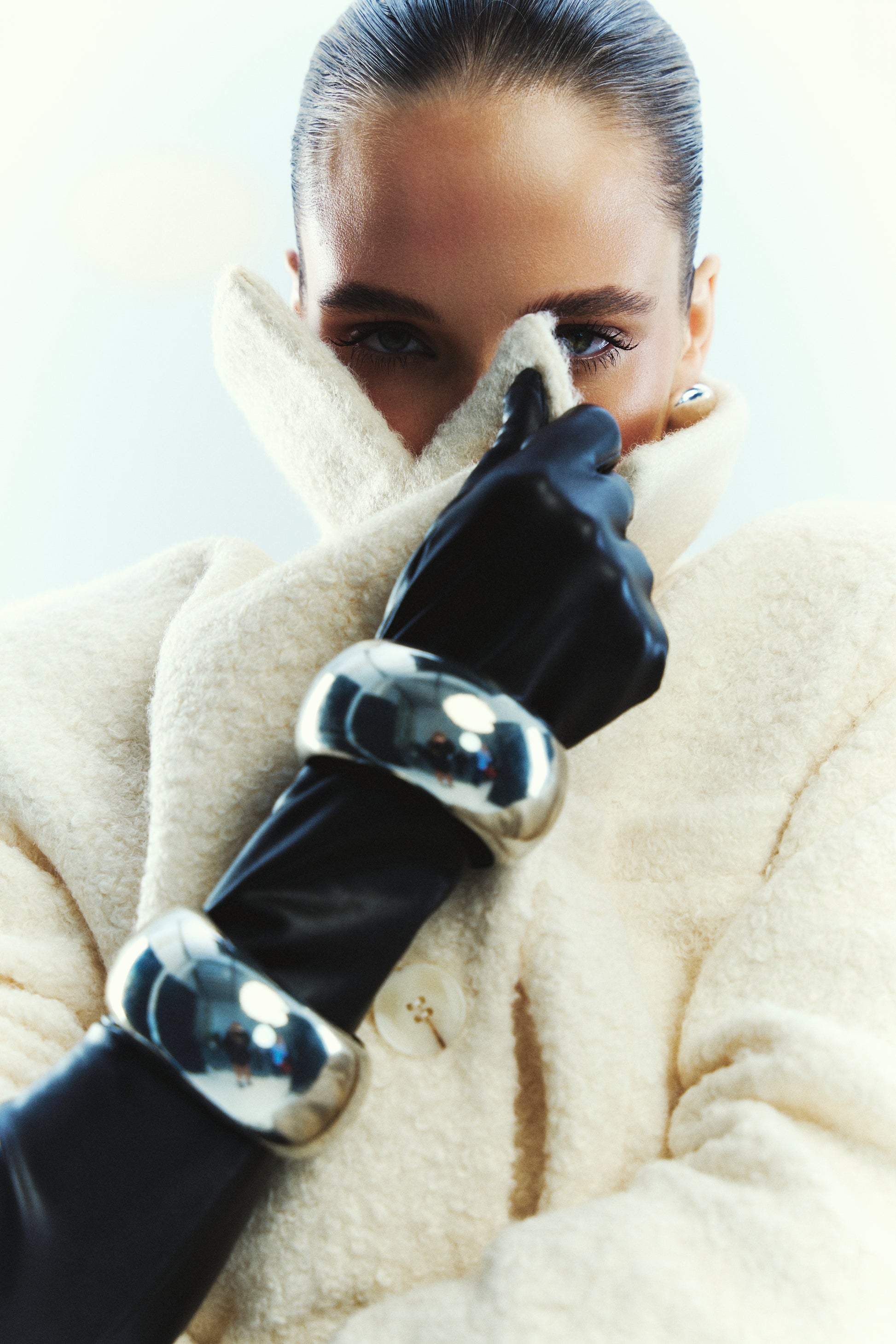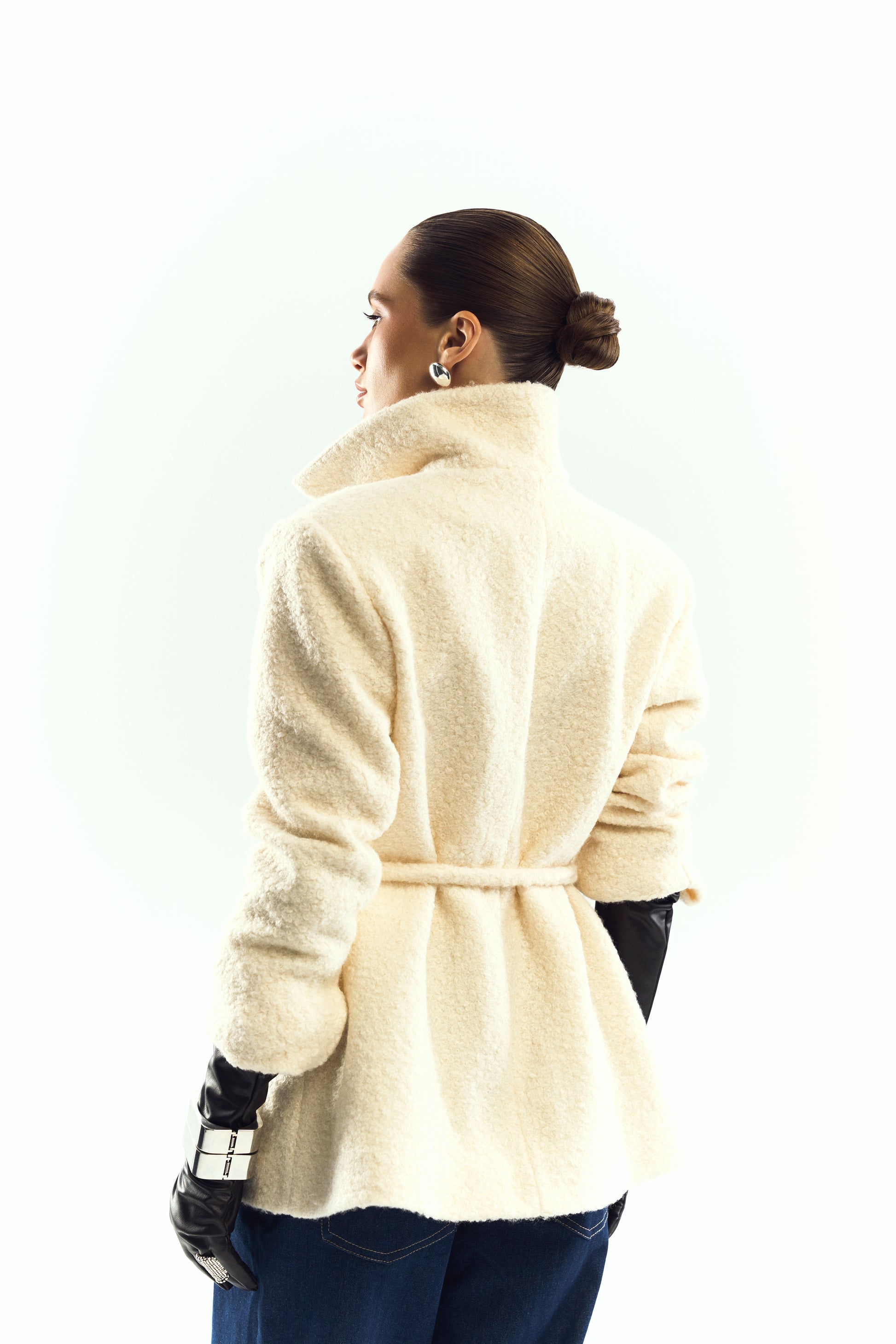 Měkká texturovaná tkanina s příměsí vlny v teplém krémovém odstínu spojuje eleganci a jemnost. Pás zvýrazňuje siluetu a vysoký límec dodává outfitu charakter. 60% vlna, 32% polyester, 8% elastan