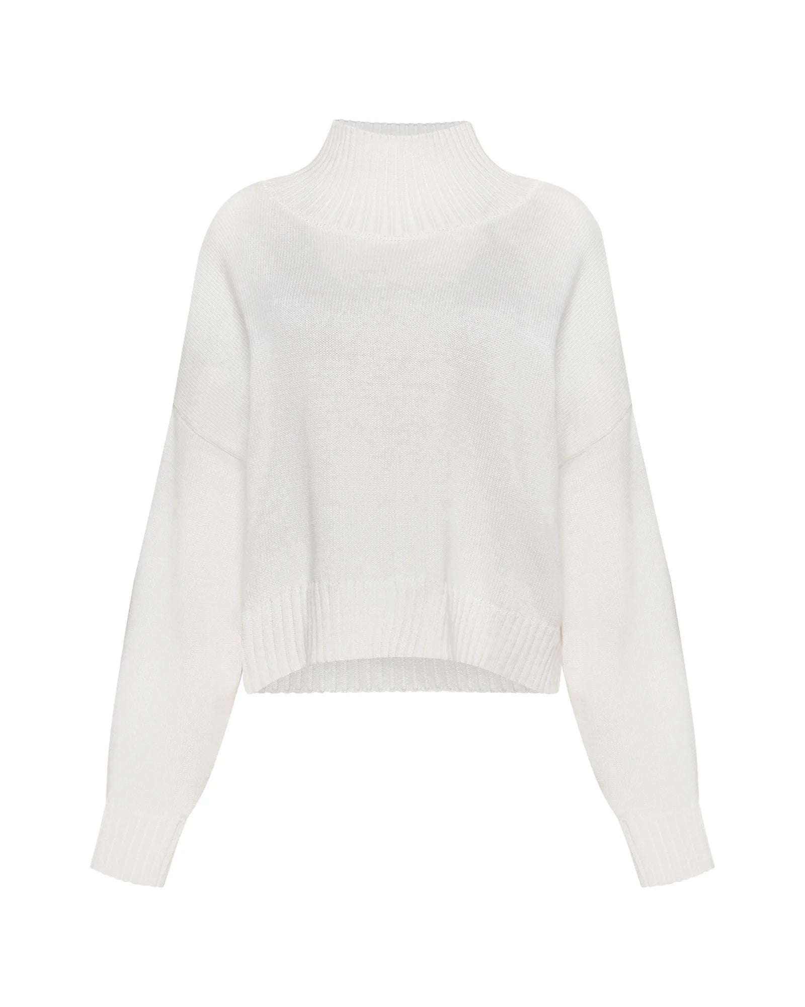 Pletený zkrácený svetr se stojáčkem a dlouhými volnými rukávy. Svetr má volný střih, prodloužený zadní díl a spadlou linii ramen. Hustá hladká pletenina je doplněna výrazným žebrováním na spodním lemu, manžetách a límci