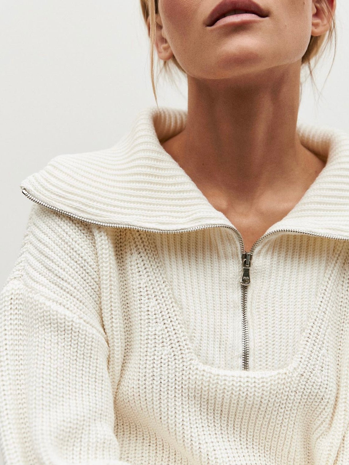 Pletený oversize svetr s dlouhými volnými rukávy s manžetou a velkým klopovým límcem na zip. Vyrobený z objemné strukturované pleteniny v přírodních odstínech. Skvěle se hodí k volným kalhotám.